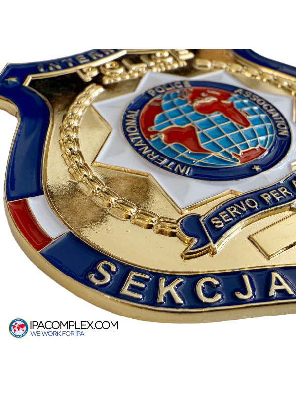 Ekskluzywna odznaka Międzynarodowego Stowarzyszenia Policji (IPA), wykonana z wysokiej jakości metalu w IPACOMPLEX©. Kształt tarczy policyjnej z charakterystycznym motywem globu i hasłem „Servo per Amikeco”. Wymiary: ok. 7,5 cm wysokości × 6,5 cm szerokości. Odznaka bazuje na oficjalnym logotypie IPA i pasuje do portfeli dostępnych na stronie ipacomplex.com. Wykończona z najwyższą precyzją, symbolizuje profesjonalizm i międzynarodową solidarność.